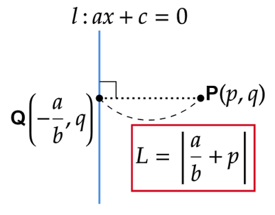 $\text{PQ}=L$なので、点$\text{P}(p, q)$と直線$l:\ ax+by+c=0$の距離$L$は