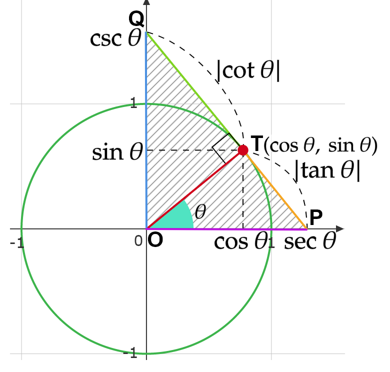 $\sinθ,\cosθ,\cscθ,\secθ$は座標として現れますが、$\tanθ,\cotθ$は距離として現れるので$θ$がどの象限にあるのかで符号を判断する必要があります。