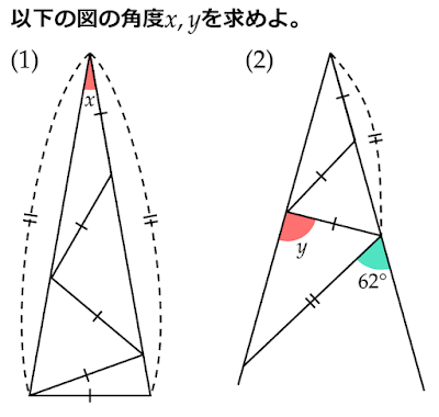 $△\text{ABC}$において$\text{BA}=\text{BC}$である二等辺三角形なので$∠\text{BAC}=∠\text{BCA}=x$となります。